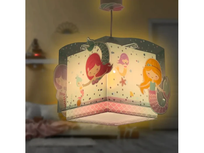 παιδικό φωτιστικό οροφής με θέμα τις γοργόνες κατάλληλο για γενικό φωτισμό. Είναι διπλού τοιχώματος με διάφανο το εξωτερικό του τοίχωμα και φωσφορίζοντα μαγικά μέρη στο σκοτάδι. Κατασκευασμένο από συνθετικό υλικό αντοχής λεπτού πολυπροπυλενίου και ανεξίτηλες εκτυπώσεις. Παρέχεται διαχυτής φωτός για τις μικρότερες ηλικίες προσφέροντας ομοιόμορφο φωτισμό αλλά και προστασία στα μάτια. Το κιτ ανάρτησης στο Mermaids παιδικό