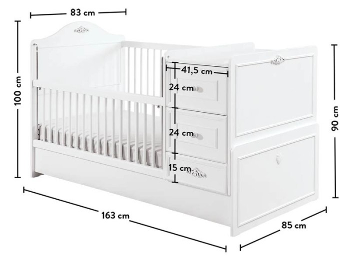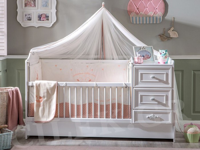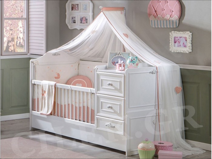 Η βρεφική κούνια της σειράς Romantic Baby είναι σχεδιασμένη για να εξυπηρετεί εσάς και το μωρό σας με όλες τις ανέσεις του. Διατίθεται σε λευκό χρώμα ενώ διαθέτει μεγάλα και ευρύχωρα συρτάρια αποθήκευσης, έξτρα μεγάλο συρτάρι αποθήκευσης (κάτω από το κρεβάτι), τηλεσκοπικά κάγκελα για καλύτερη πρόσβαση με το μωρό σας, κάγκελα που κατεβαίνουν με εύκολο ξεκλείδωμα και την καταπληκτική δυνατότητα να μετατρέπεται, καθώς μεγαλώνει το παιδί σας, σε παιδικό εφηβικό κρεβάτι.