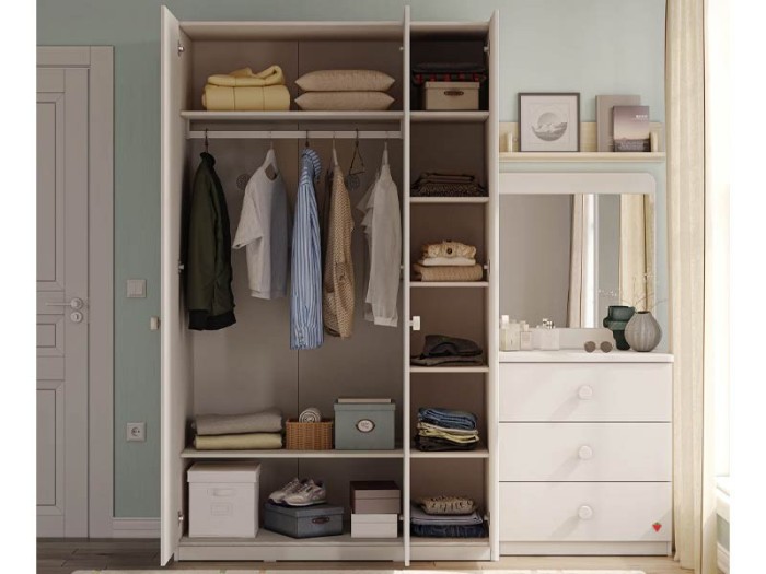 Τα πολυάριθμα ράφια και ο χώρος για κρεμάστρες σάς βοηθούν να οργανώσετε τα υπάρχοντά σας κατηγοριοποιώντας τα. Οι μεντεσέδες με φρένο εξασφαλίζουν αθόρυβη και ασφαλή λειτουργία, ενώ οι κομψές ξύλινες λαβές προσθέτουν μια φυσική πινελιά. Οι μινιμαλιστικές γραμμές της προσθέτουν μια κομψή πινελιά στο δωμάτιό σας.