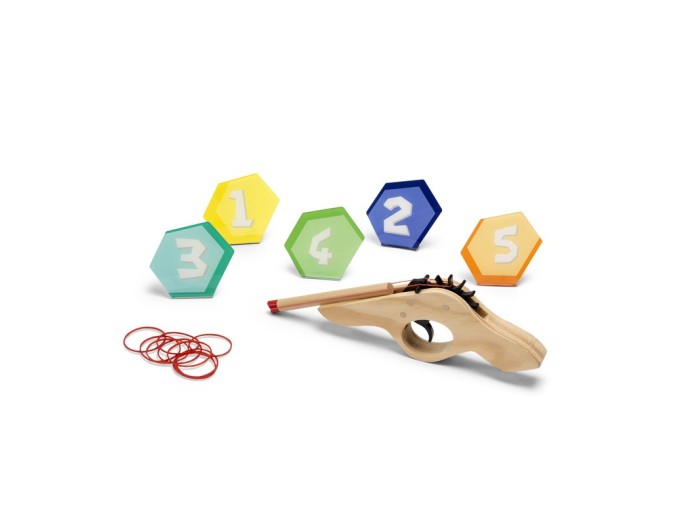 Τοποθέτησε τους στόχους στην σειρά. Βάλε τα λαστιχάκια στο ξύλινο όπλο και κάνε μερικά βήματα πίσω.