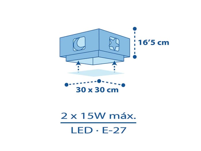 Παιδικό φωτιστικό οροφής τύπου πλαφονιέρα κατάλληλο για γενικό φωτισμό και όλες τις δραστηριότητες των παιδιών. Το Moonlight Blue πλαφονιέρα οροφής είναι διπλού τοιχώματος από άκαυστο λεπτό πολυπροπυλένιο και φωσφορίζοντα στο σκοτάδι εξωτερικά μέρη. Τοποθετείται εύκολα και γρήγορα και είναι εφοδιασμένο με δύο θέσεις λαμπτήρων LED για πραγματικά άπλετο φως στο δωμάτιο. Παρέχεται διαχυτής φωτός για τις μικρότερες ηλικίες που προσφέρει
