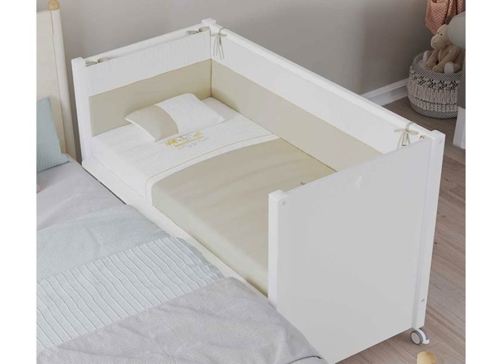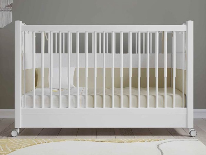 Βρεφική κούνια με τροχούς. Εκτός από την πρακτική χρήση του με τους 4 τροχούς του που μπορούν να περιστρέφονται 360°, προσφέρει το πλεονέκτημα της πολυλειτουργικής χρήσης με το ρυθμιζόμενα κάγκελα μπροστά που επιτρέπει στη μητέρα να φτάσει εύκολα στο μωρό της. 2 από τους τροχούς είναι εξοπλισμένοι με φρένα για τη στερέωση της βρεφικής κούνιας. Χάρη στους τροχούς, το προϊόν μπορεί να χρησιμοποιηθεί εύκολα μετακινώντας το στην επιθυμητή θέση στο δωμάτιο.